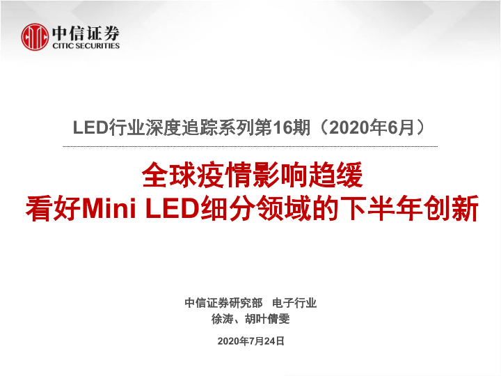 【中信证券】【20200724】LED行业深度追踪系列第16期(2020年6月):全球疫情影响趋缓,看好Mini LED细分领域的下半年创新-20页