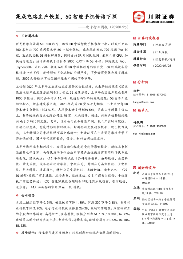 【川财证券】【20200725】电子行业周报:集成电路生产恢复,5G智能手机价格下探-12页