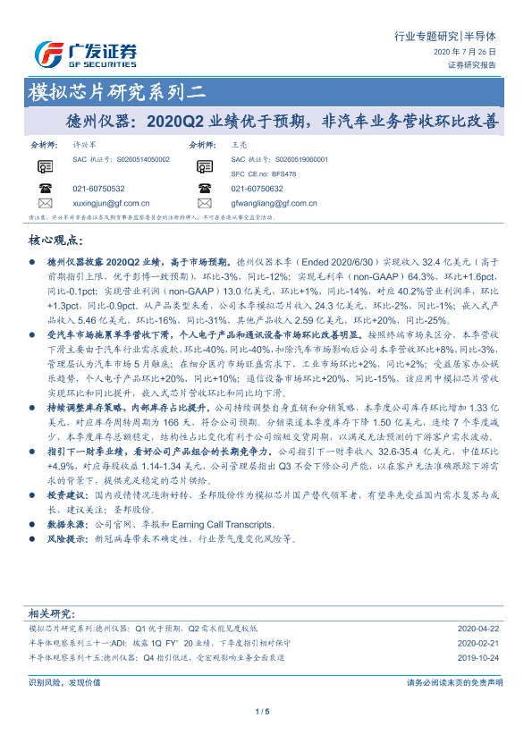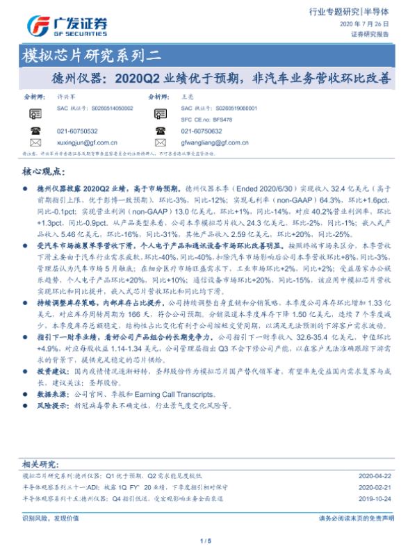 业绩报告 半导体 德州仪器 模拟芯片 非汽车业务