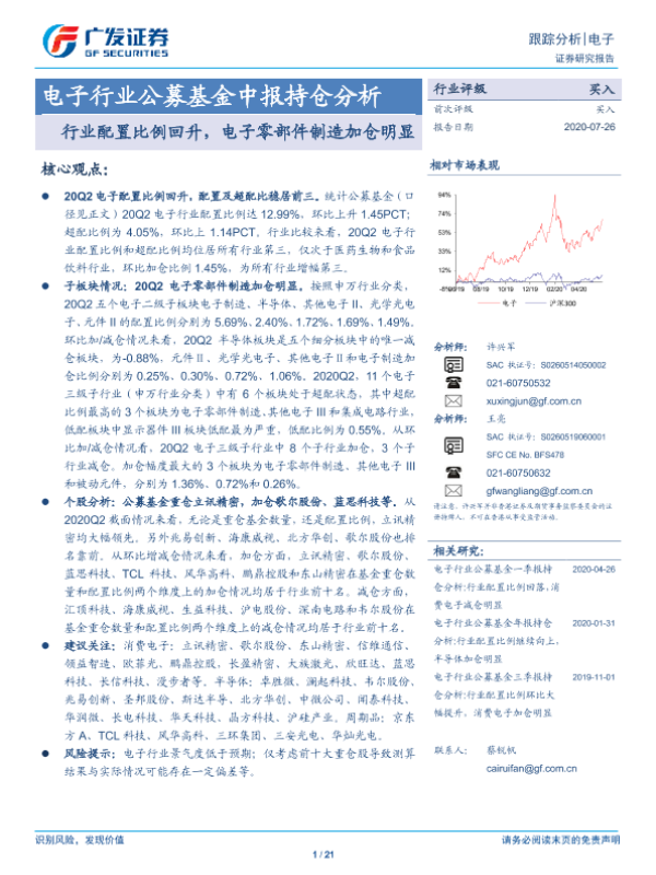 【广发证券】【20200726】电子行业公募基金中报持仓分析:行业配置比例回升,电子零部件制造加仓明显-21页