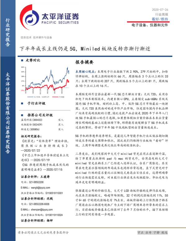 【太平洋证券】【20200726】20200726-太平洋-电子设备、仪器和元件行业周报:下半年成长主线仍是5G,Miniled板块反转亦渐行渐近-14页