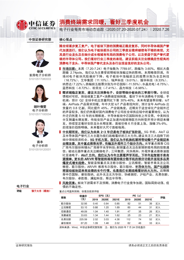 【中信证券】【20200726】电子行业每周市场动态追踪:消费终端需求回暖,看好三季度机会-19页