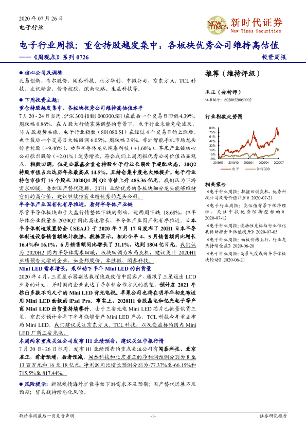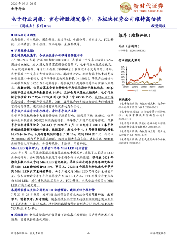 【新时代证券】【20200726】电子行业周报:重仓持股越发集中,各板块优秀公司维持高估值——《周观点》系列-22页