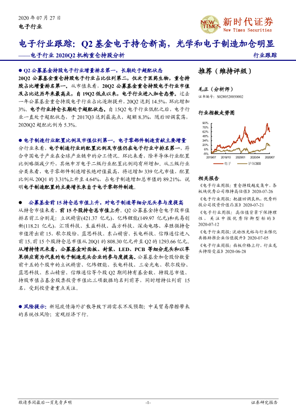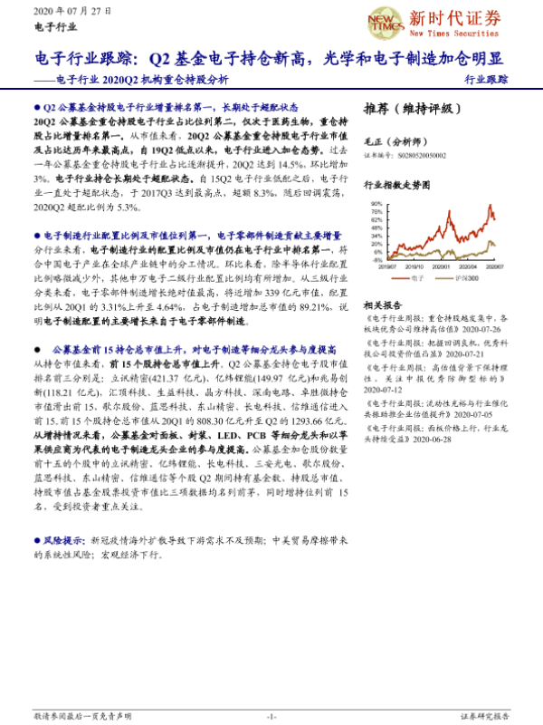 【新时代证券】【20200727】电子行业跟踪:Q2基金电子持仓新高,光学和电子制造加仓明显-13页