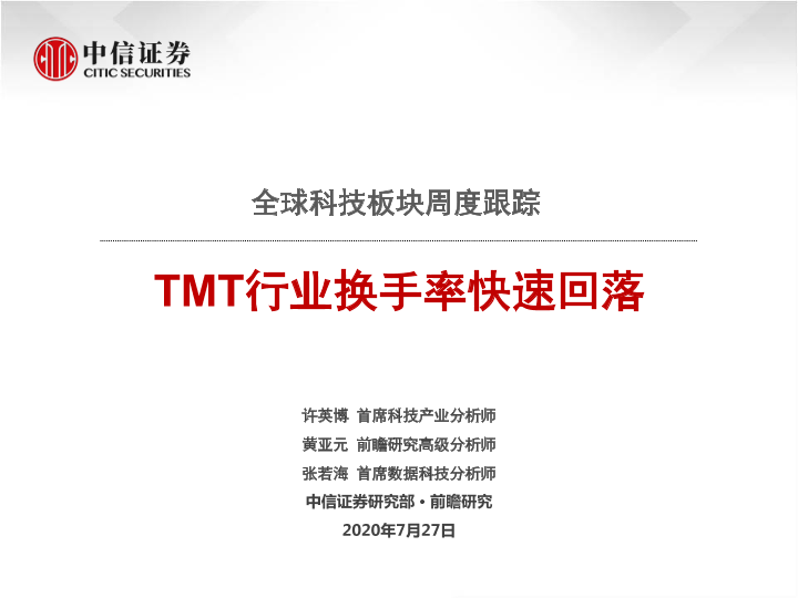 【中信证券】【20200727】全球科技板块周度跟踪:TMT行业换手率快速回落-34页