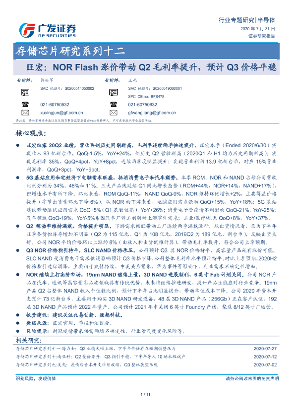 【广发证券】【20200731】旺宏:NOR Flash涨价带动Q2毛利率提升,预计Q3价格平稳-11页