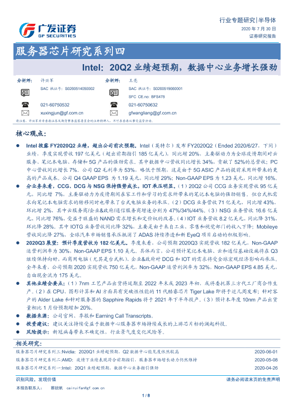 【广发证券】【20200730】Intel:20Q2业绩超预期,数据中心业务增长强劲-8页