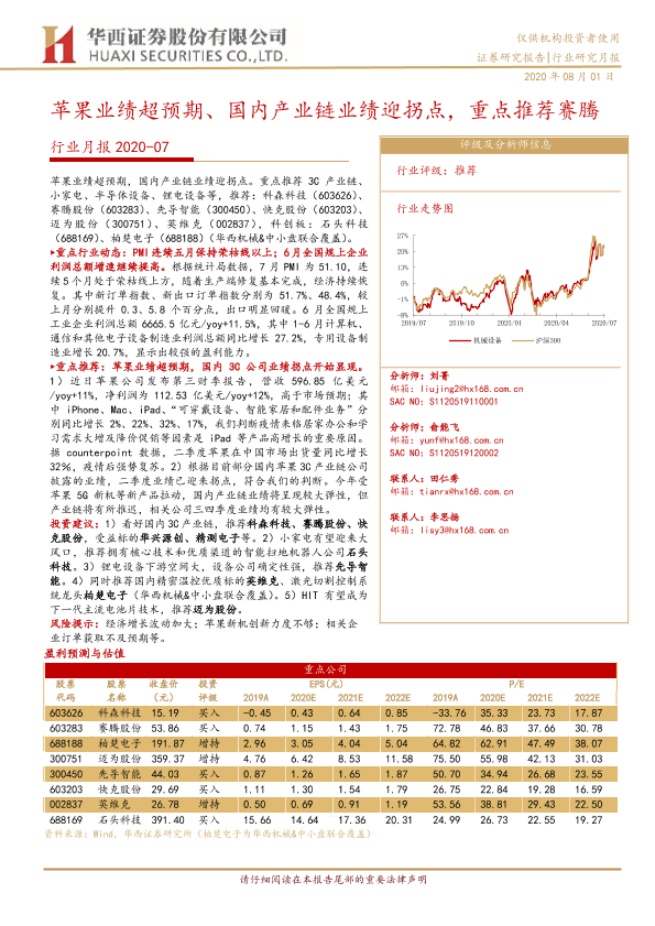 【华西证券】【20200801】20200801-华西证券-电子行业月报:苹果业绩超预期、国内产业链业绩迎拐点,重点推荐赛腾-19页