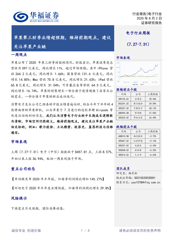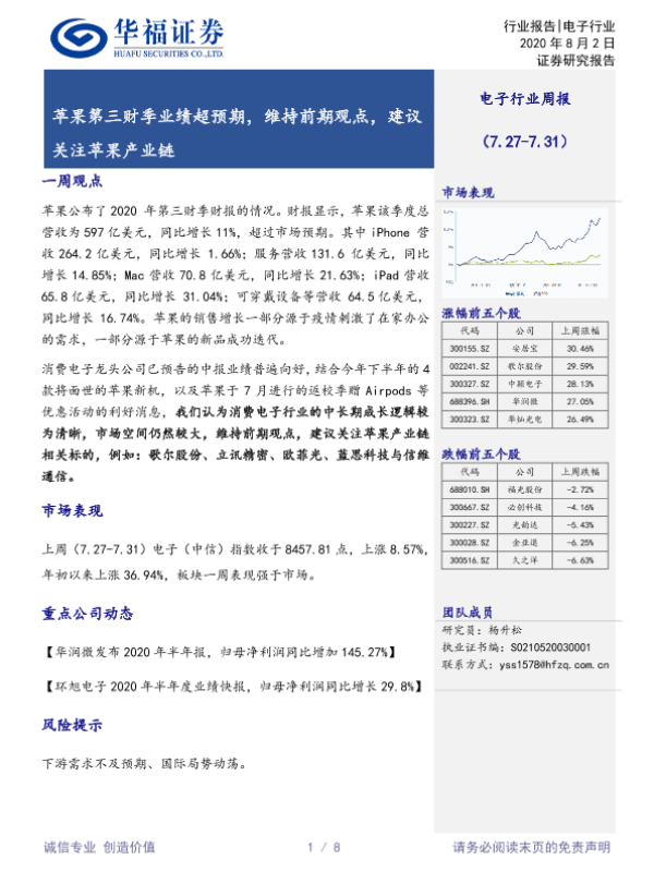 【华福证券】【20200802】20200802-华福证券-电子行业周报:苹果第三财季业绩超预期,维持前期观点,建议关注苹果产业链-8页