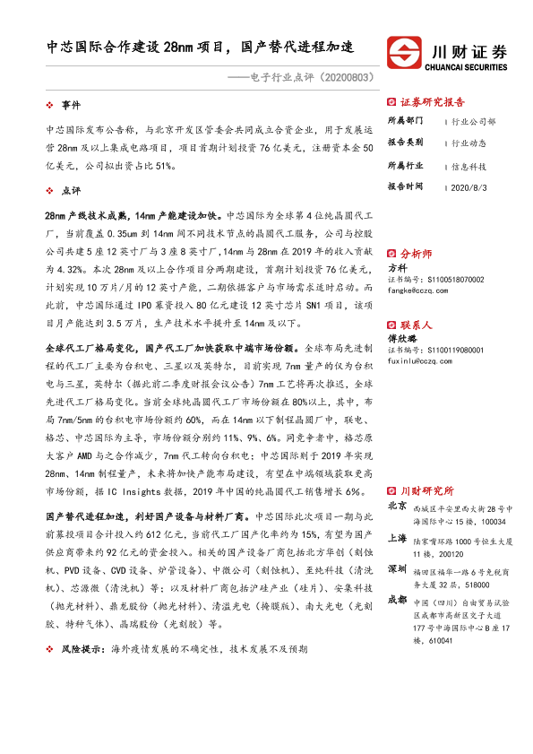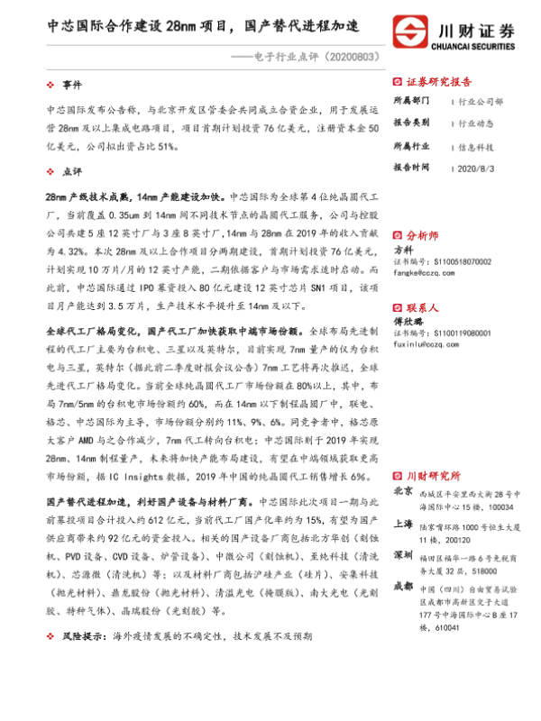 【川财证券】【20200803】电子行业点评:中芯国际合作建设28nm项目,国产替代进程加速-3页
