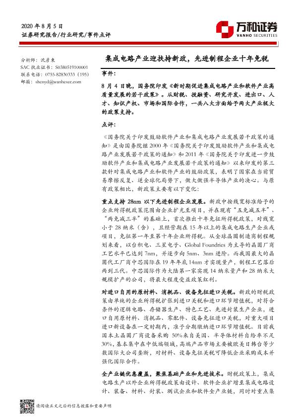 【万和证券】【20200805】电子行业事件点评:集成电路产业迎扶持新政,先进制程企业十年免税-5页