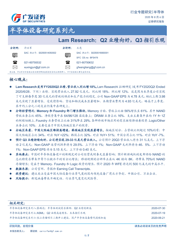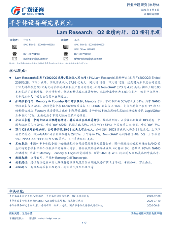【广发证券】【20200806】Lam Research:Q2业绩向好,Q3指引乐观-7页