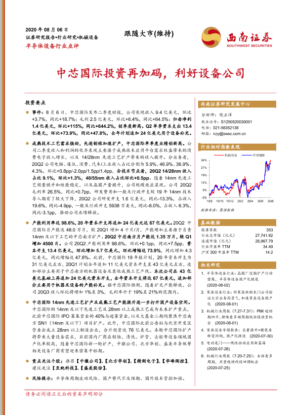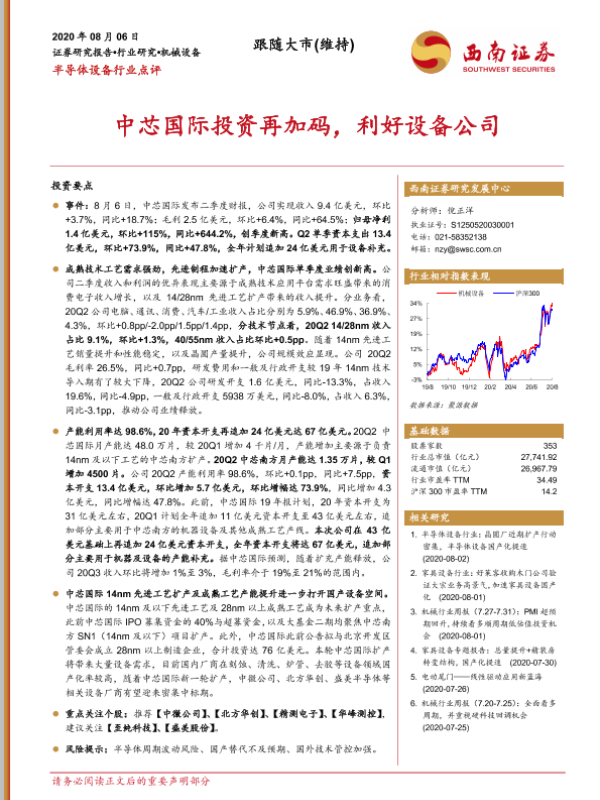 【西南证券】【20200806】半导体设备行业点评:中芯国际投资再加码,利好设备公司-3页