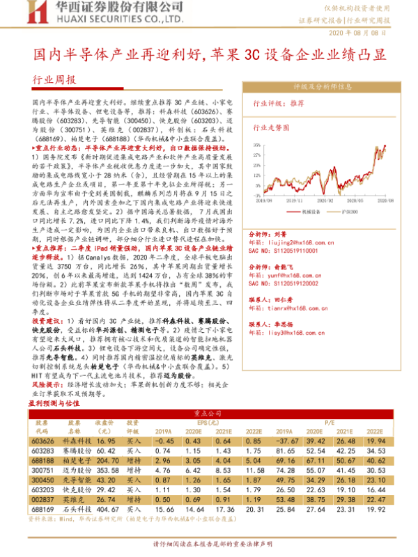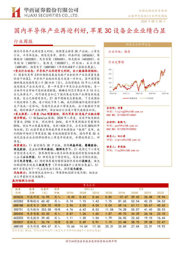 【华西证券】【20200808】20200808-华西证券-半导体行业周报:国内半导体产业再迎利好,苹果3C设备企业业绩凸显-20页