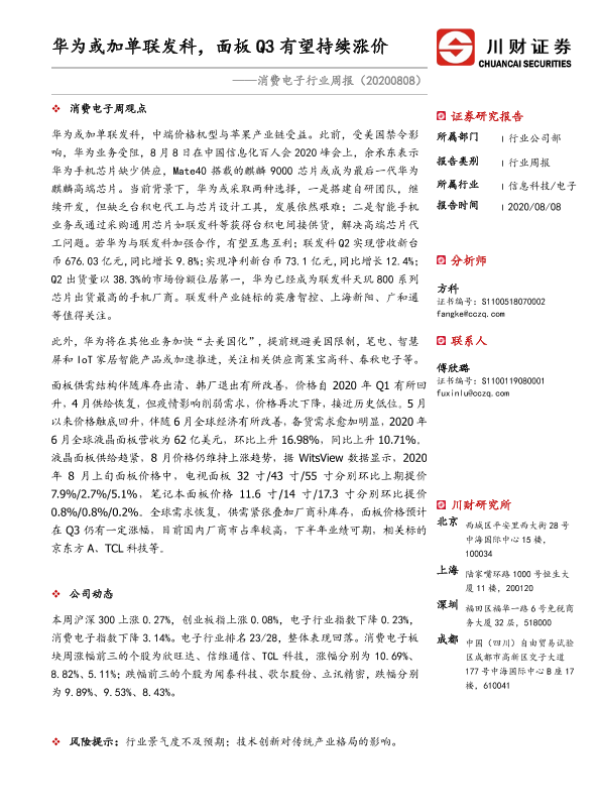 【川财证券】【20200808】消费电子行业周报:华为或加单联发科,面板Q3有望持续涨价-10页