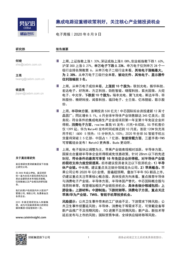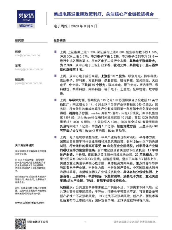 【莫尼塔研究】【20200809】电子周报:集成电路迎重磅政策利好,关注核心产业链投资机会-12页