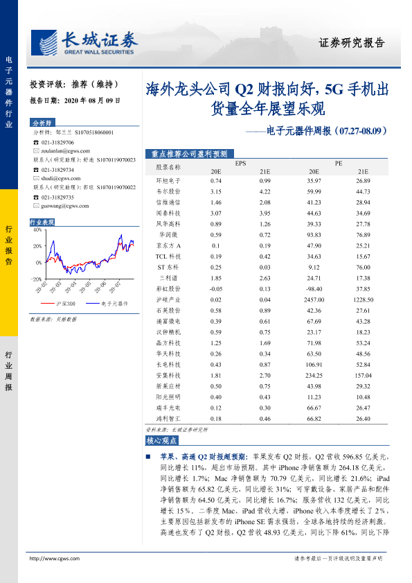 【长城证券】【20200809】20200809-长城证券-电子元器件周报:海外龙头公司Q2财报向好,5G手机出货量全年展望乐观-35页