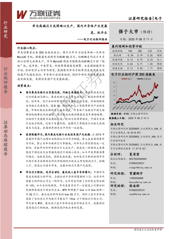 【万联证券】【20200811】20200811-万联证券-电子行业快评报告:华为高端芯片或将难以生产,国内半导体产业发展危、机并生-4页