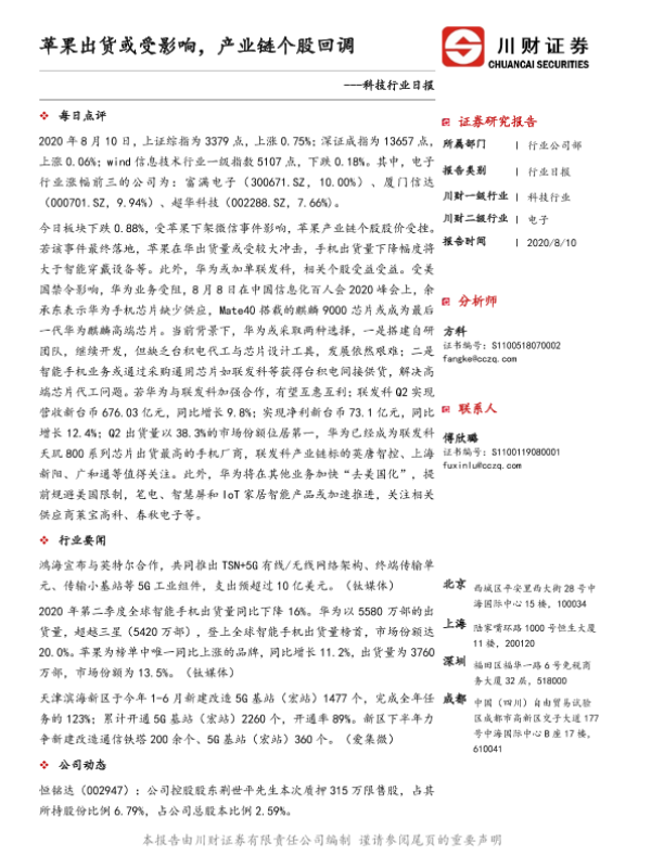 【川财证券】【20200810】科技行业日报:苹果出货或受影响,产业链个股回调-5页