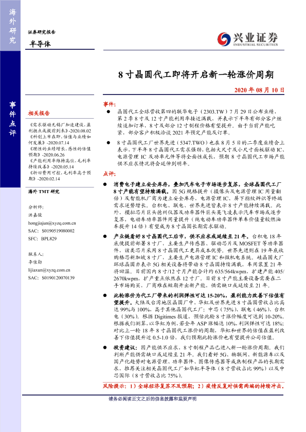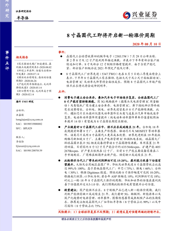【兴业证券】【20200810】8寸晶圆代工即将开启新一轮涨价周期-7页