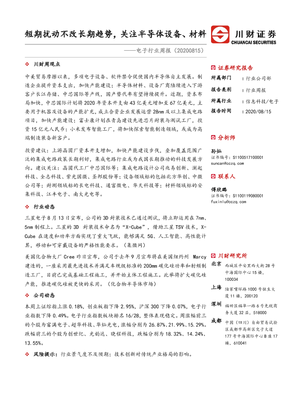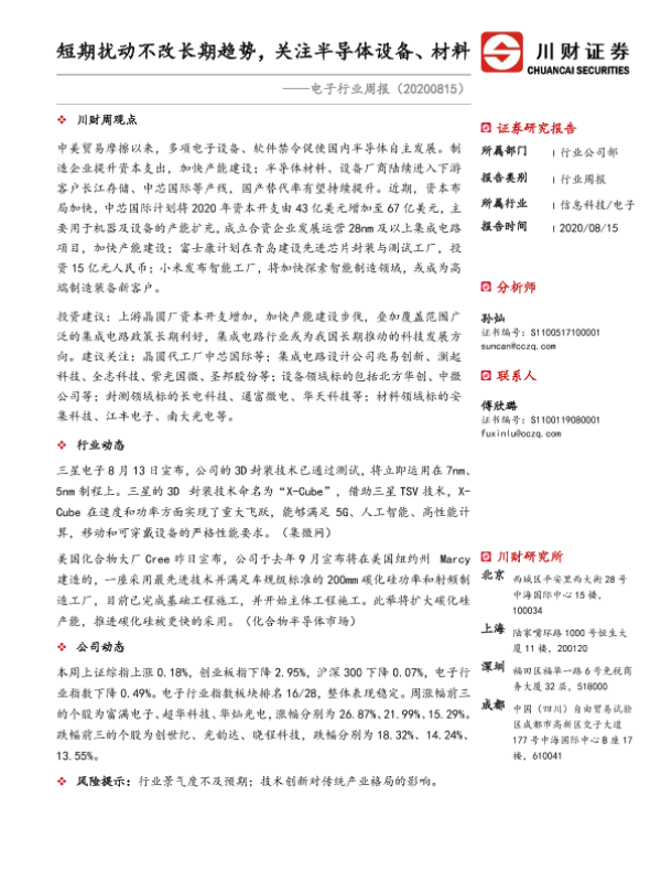 【川财证券】【20200815】20200815-川财证券-电子行业周报:短期扰动不改长期趋势,关注半导体设备、材料-12页