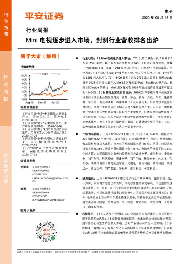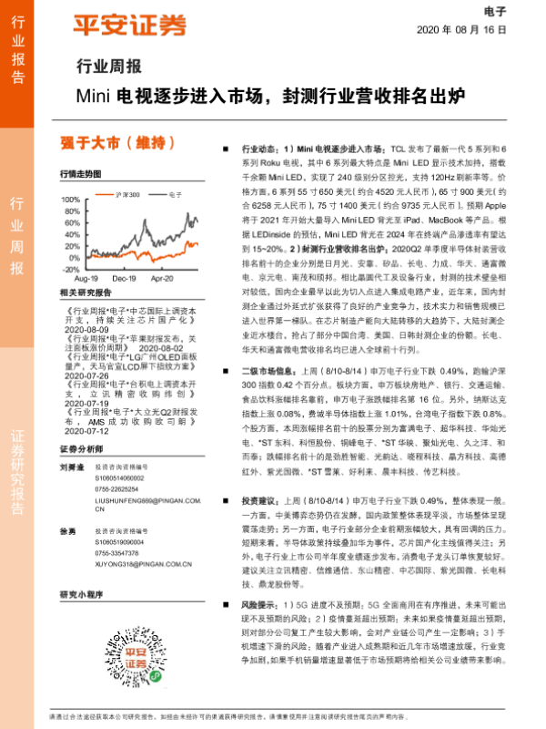 【平安证券】【20200816】电子行业周报:Mini电视逐步进入市场,封测行业营收排名出炉-6页