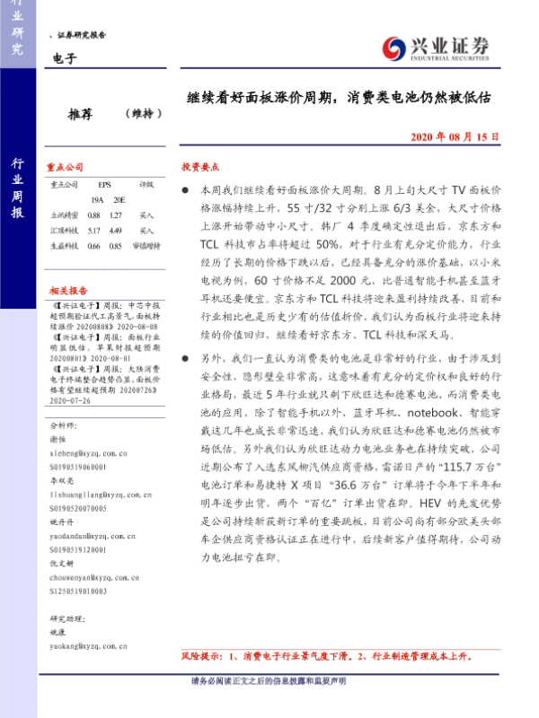 【兴业证券】【20200815】20200815-兴业证券-电子行业周报:继续看好面板涨价周期,消费类电池仍然被低估-9页