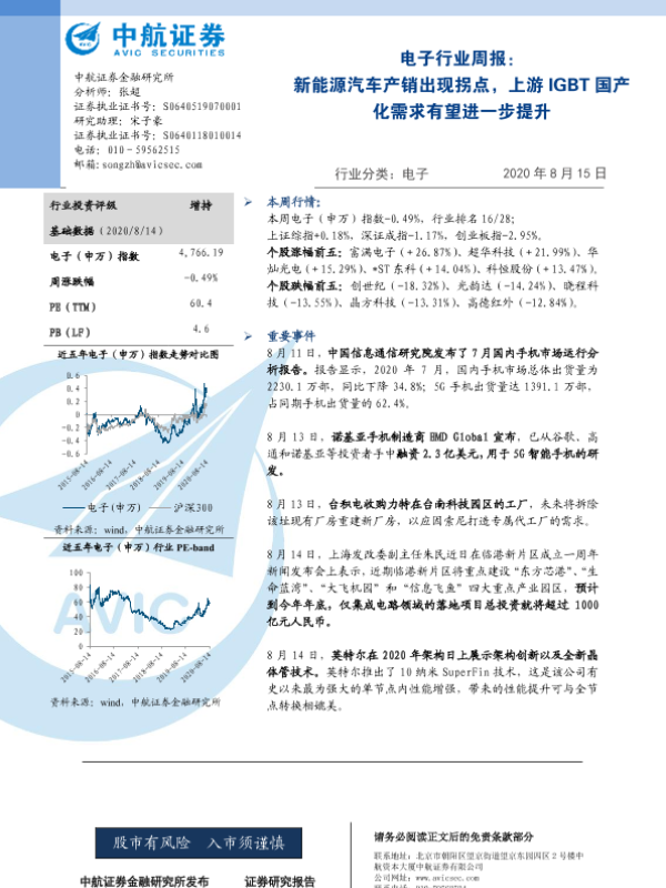 【中航证券】【20200815】20200815-中航证券-电子行业周报:新能源汽车产销出现拐点,上游IGBT国产化需求有望进一步提升-4页