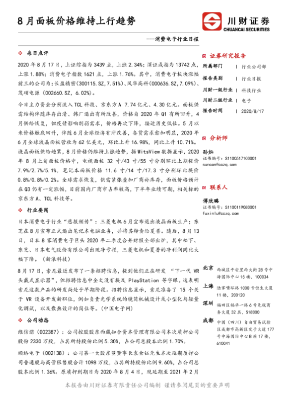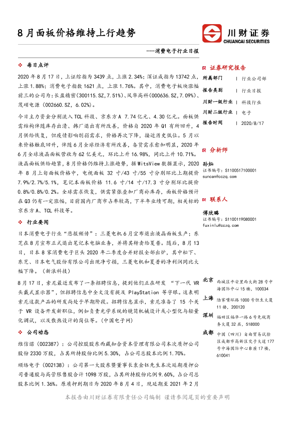 【川财证券】【20200817】消费电子行业日报:8月面板价格维持上行趋势-4页