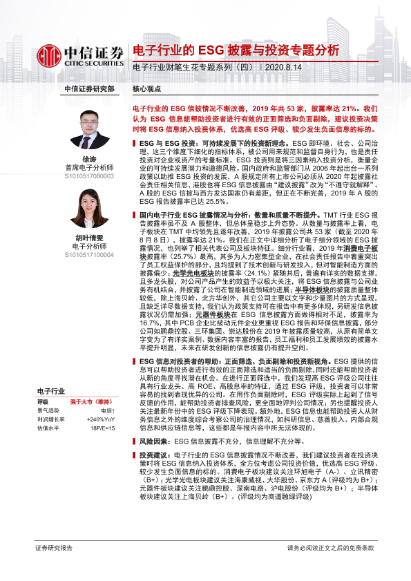 ESG披露 可持续发展 投资分析 电子行业 社会责任