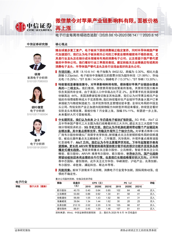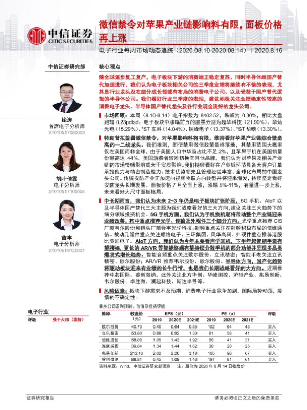 【中信证券】【20200816】电子行业每周市场动态追踪:微信禁令对苹果产业链影响料有限,面板价格再上涨-16页