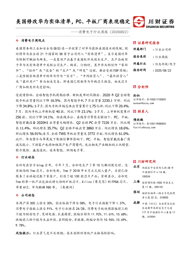 【川财证券】【20200822】20200822-川财证券-消费电子行业周报:美国修改华为实体清单,PC、平板厂商表现稳定-10页
