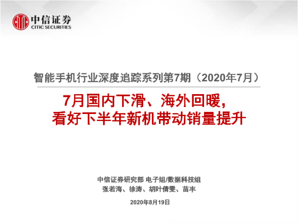 【中信证券】【20200819】智能手机行业深度追踪系列第7期(2020年7月):7月国内下滑、海外回暖,看好下半年新机带动销量提升-38页