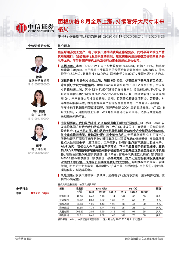 【中信证券】【20200823】电子行业每周市场动态追踪:面板价格8月全系上涨,持续看好大尺寸未来格局-17页