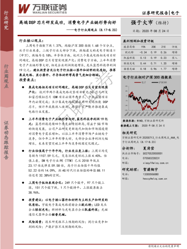 【万联证券】【20200824】20200824-万联证券-电子行业周观点:高端DSP芯片研发成功,消费电子产业链形势向好-18页