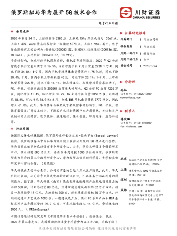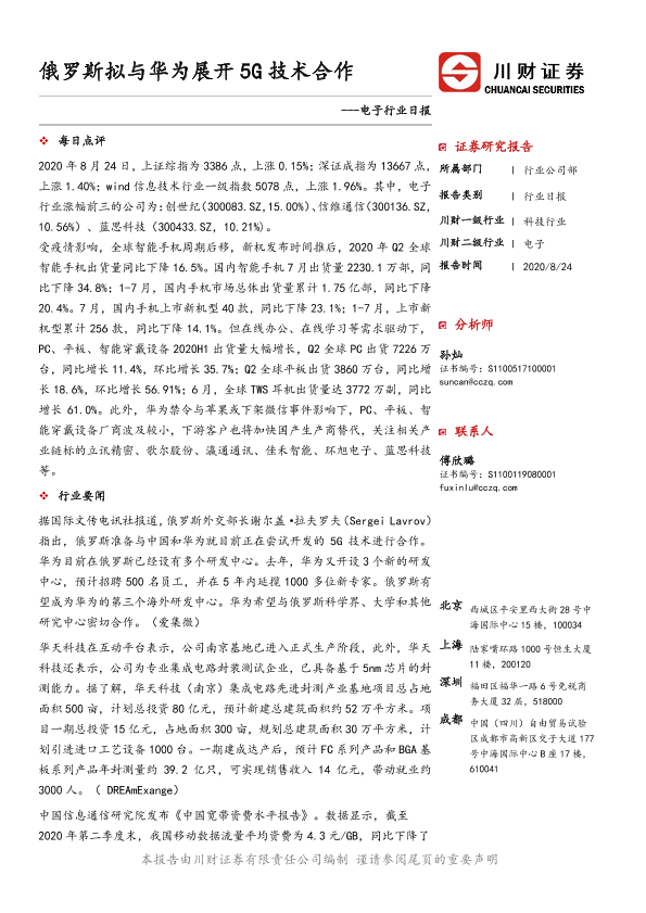 【川财证券】【20200824】电子行业日报:俄罗斯拟与华为展开5G技术合作-5页