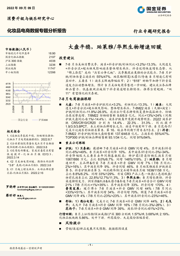 【国金证券】【20220909】化妆品行业电商数据专题分析报告:大盘平稳,珀莱雅华熙生物增速回暖-23页