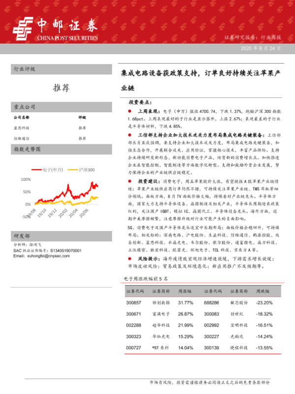 【中邮证券】【20200824】20200824-中邮证券-电子行业周报:集成电路设备获政策支持,订单良好持续关注苹果产业链-8页