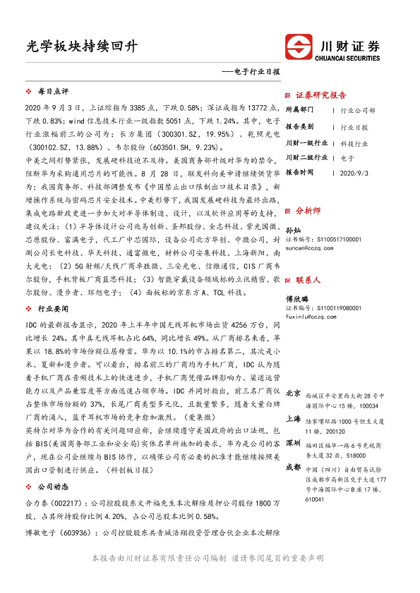 【川财证券】【20200903】电子行业日报:光学板块持续回升-5页