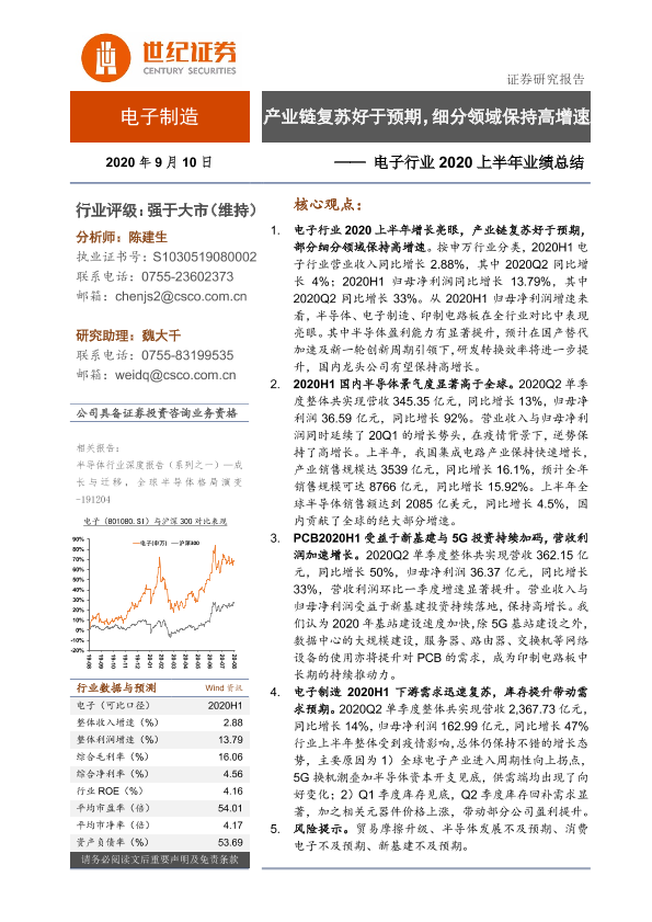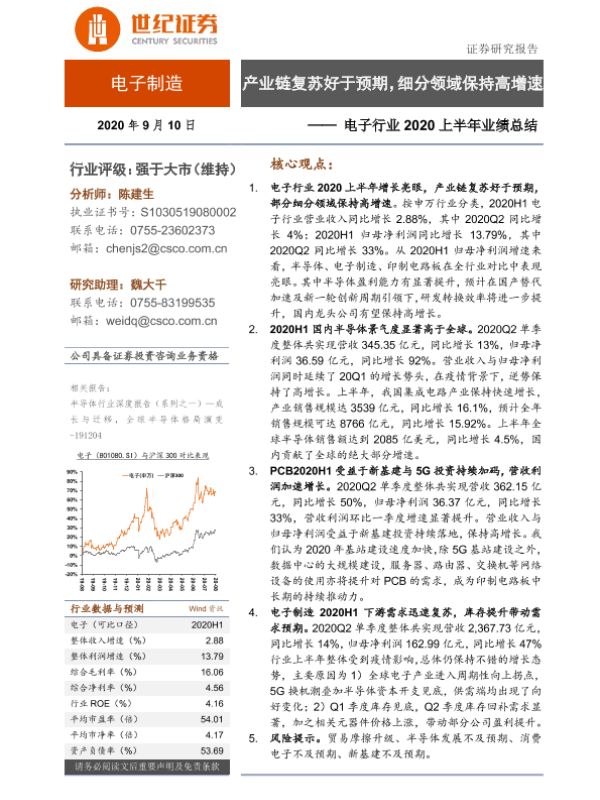 【世纪证券】【20200910】电子行业2020上半年业绩总结:产业链复苏好于预期,细分领域保持高增速-22页