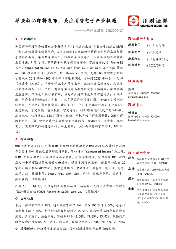 【川财证券】【20200912】20200912-川财证券-电子行业周报:苹果新品即将发布,关注消费电子产业机遇-10页