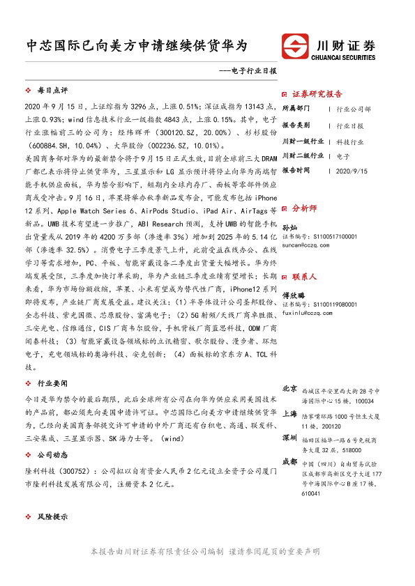 【川财证券】【20200915】20200915-川财证券-电子行业日报:中芯国际已向美方申请继续供货华为-4页