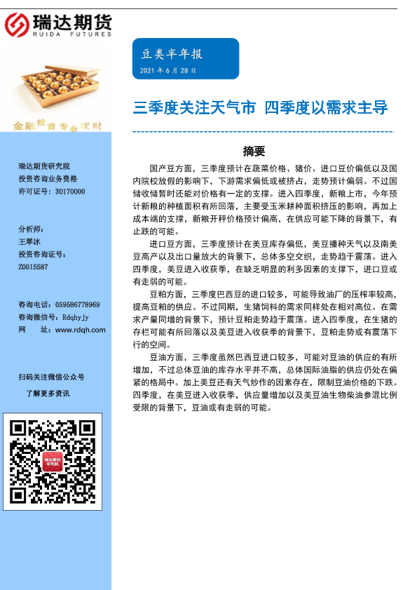 【瑞达期货】【20210628】豆类半年报:三季度关注天气市,四季度以需求主导-26页