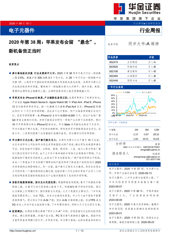 【华金证券】【20200919】电子元器件2020年第38周:苹果发布会留“悬念”,新机备货正当时-13页