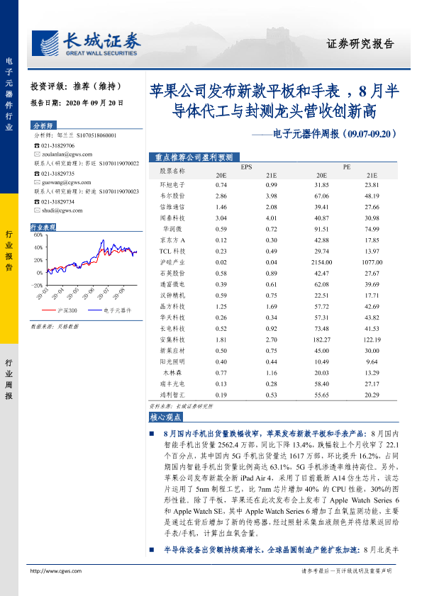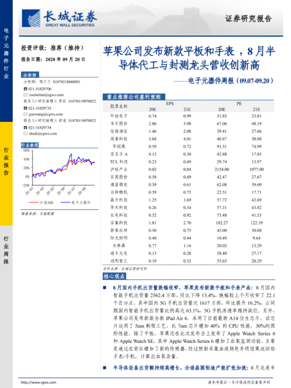 【长城证券】【20200920】20200920-长城证券-电子元器件周报:苹果公司发布新款平板和手表,8月半导体代工与封测龙头营收创新高-27页