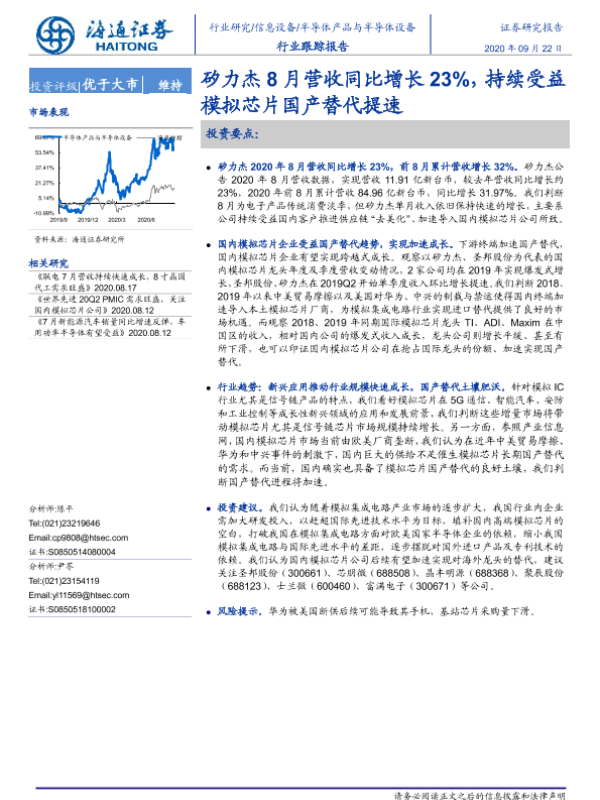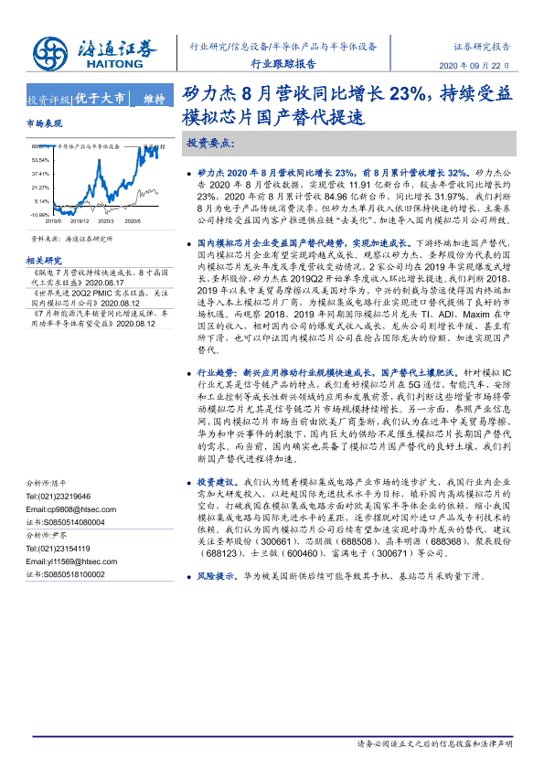 【海通证券】【20200922】半导体产品与半导体设备行业跟踪报告:矽力杰8月营收同比增长23%,持续受益模拟芯片国产替代提速-2页