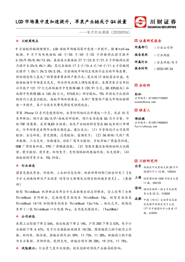 【川财证券】【20200926】20200926-川财证券-电子行业周报:LCD市场集中度加速提升,苹果产业链或于Q4放量-11页