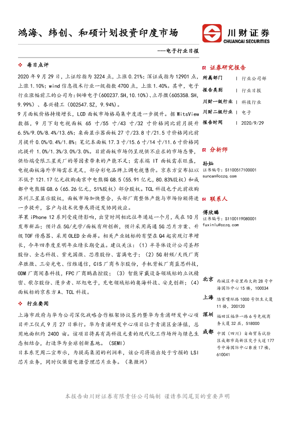 【川财证券】【20200929】电子行业日报:鸿海、纬创、和硕计划投资印度市场-5页