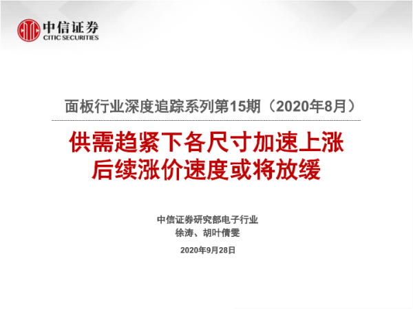 【中信证券】【20200928】面板行业深度追踪系列第15期(2020年8月):供需趋紧下各尺寸加速上涨 后续涨价速度或将放缓-21页