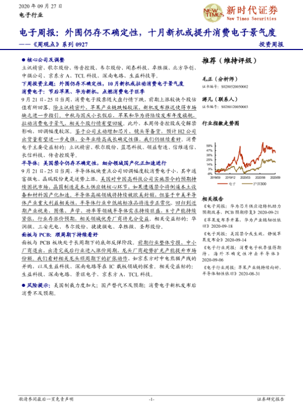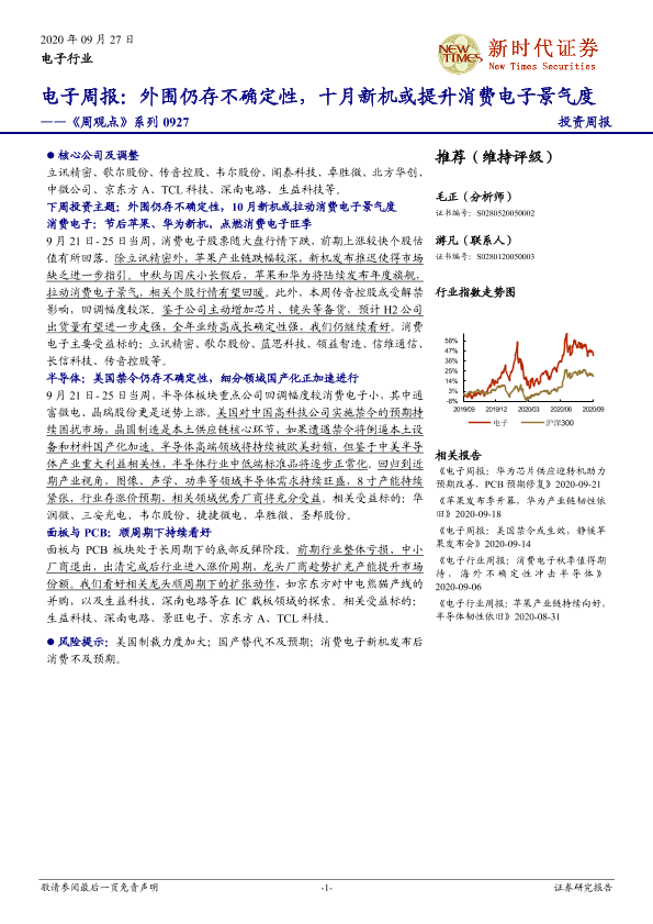 【新时代证券】【20200927】电子周报:外围仍存不确定性,十月新机或提升消费电子景气度-16页